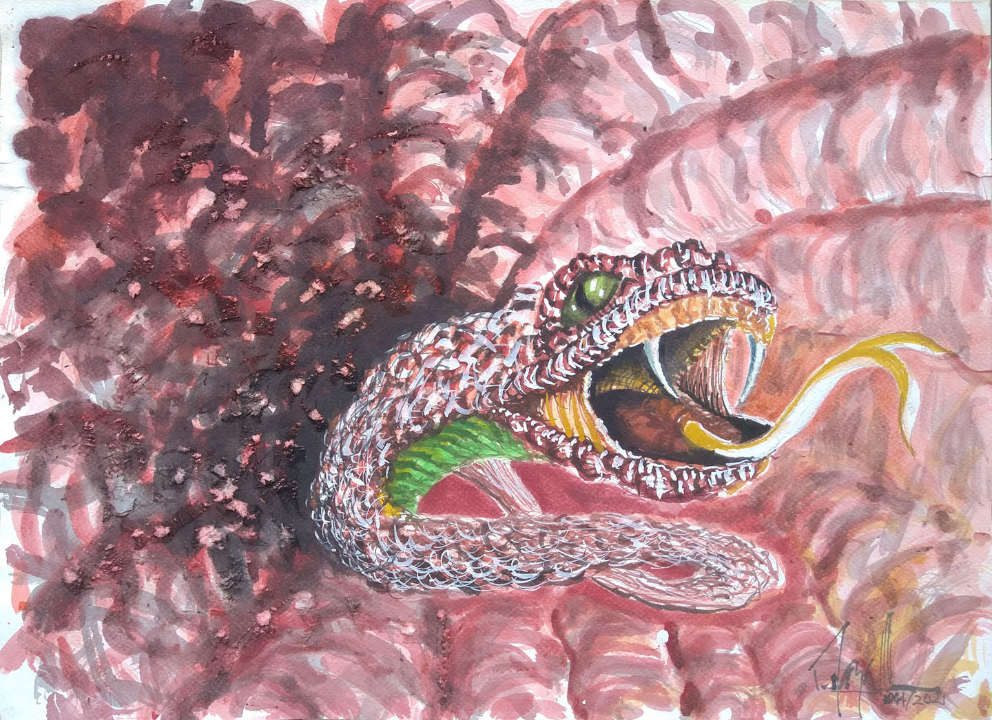 Entré a hospitalización por covid el 30 de diciembre de 2020 y salí el 5 de enero de 2021. Los primeros días fueron de mucho temor, la segunda noche antes de conciliar el sueño, tuve la visión de una esfera que en una de sus apartes se convertía en un elemento tubular zigzagueante, al llegar muy cerca de mí, pude apreciar en su punta, la cabeza de una serpiente. Por la mañana boceté su estructura, que después se convirtió en la primera acuarela del año. En las siguientes noches percibí las estructuras de las siguientes acuarelas.