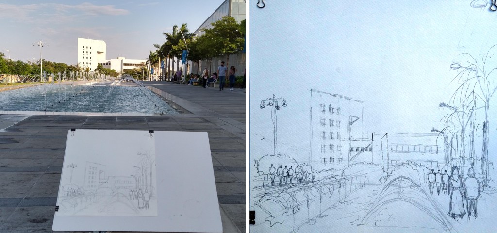 Ayer, me interesé en el cierre de la plaza allá al fondo en la fachada blanca del Banco de la República, y delante en la fuente de agua que se constituyo en un reto, ya que el agua es demasiado dinámica y brindar esa sensación de movimiento es complejo.