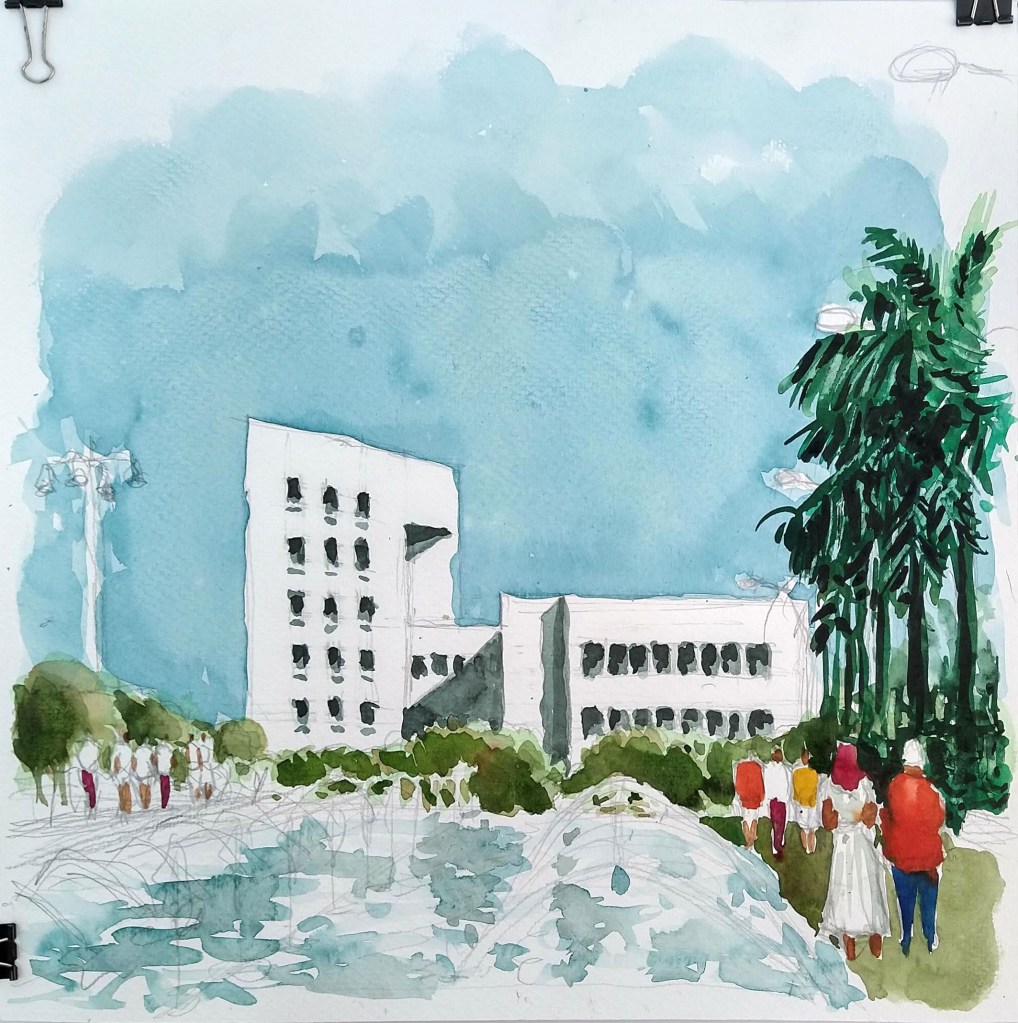 Ayer viernes 28 de enero me fui nuevamente a la Plaza de la Paz a eso de las 3:30 p.m., En esta ocasión pinté las escena desde el centro hacía el fondo al oriente; la plaza termina en el Banco de la República de Colombia, caracterizado por su fachada blanca con ventanales oscuros y el sol dando directamente sobre esta.