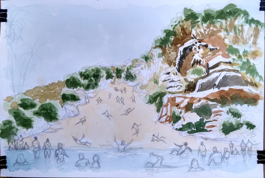 Empecé a dibujar la estructura actual del terreno con las rocas y vegetación de los laterales a la loma de arena, quitando los edificios en la parte posterior. Después agregué los diferentes elementos relatados en el párrafo anterior.