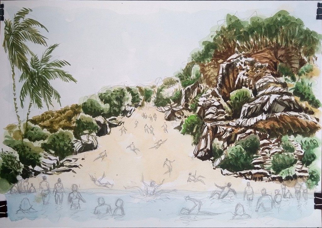 Podemos observar en el dibujo arriba todo el escenario a lápiz. Seguidamente empecé a colorear con las pinceladas de fondo: cielo, agua y terreno; para después ilustrar las rocas y la vegetación actuales.