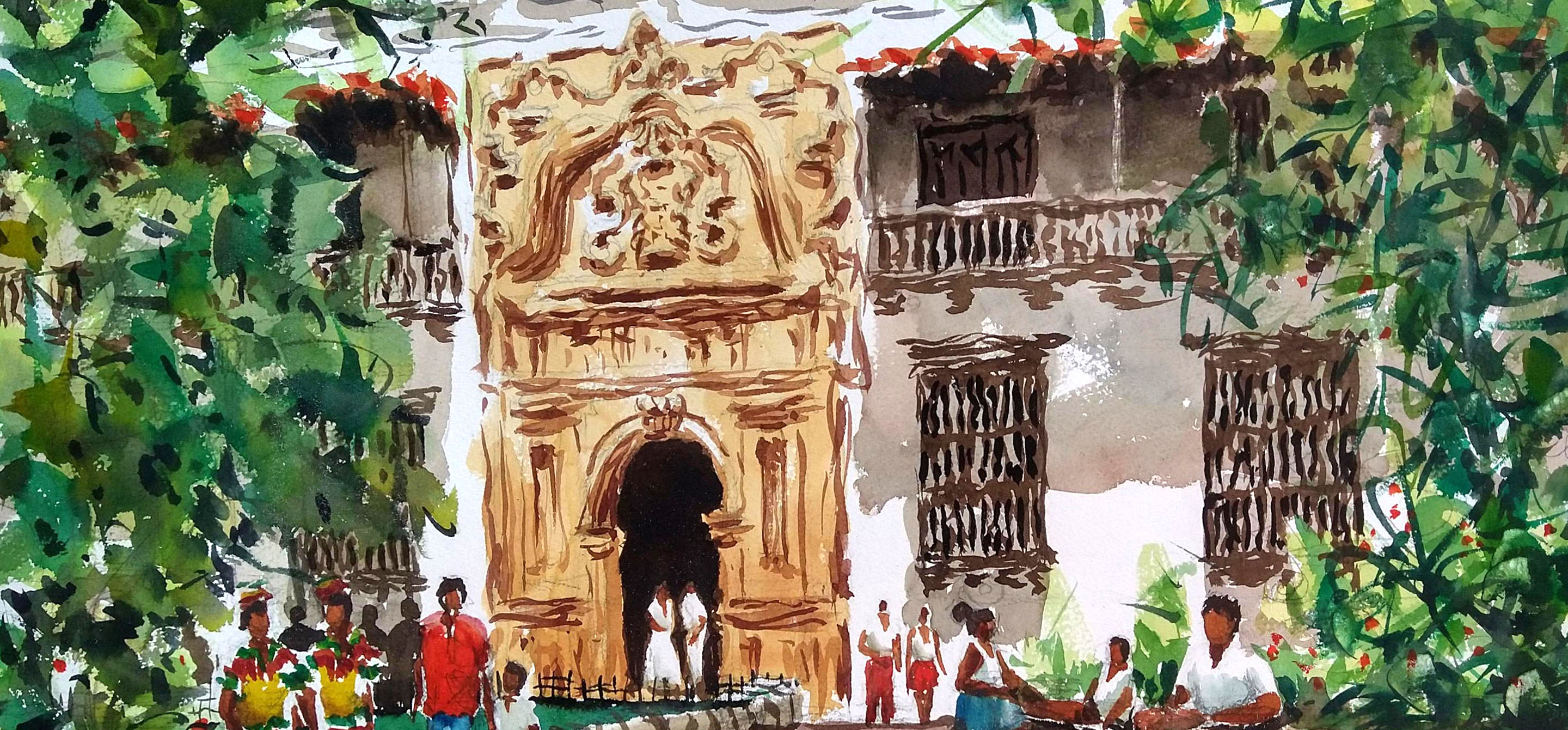 Breve historia de la edificación barroca y colonial de las más representativas de Cartagena de Indias. Y a la vez ilustra el proceso creativo paso a paso de la pintura de su portal.