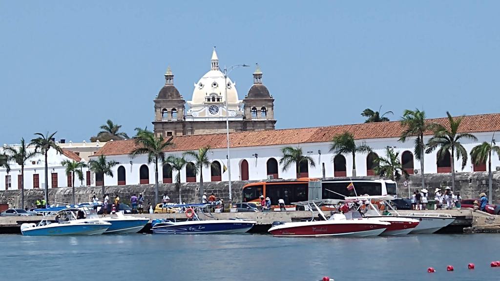 En el mes de abril seguí mi estadía en Cartagena de Indias. Del Muelle de los Pegasos siempre me ha fascinado su vista hacía las torres de San Pedro Claver como atractivo visual de fondo. Delante encontramos la edificación de dos pisos de la Alcaldía de Cartagena, con sus paredes blancas cubierta en teja de barro y ventanales en arcos de medio punto oscuros. Más adelante percibimos las murallas en todo su esplendor, la calle con abundante tránsito de vehículos y gente. Y al frente la vía acuática constituida por el Muelle de los Pegasos en sí con la diversidad de embarcaciones. Una mañana me fui con mis acuarelas, papeles y pinceles y he aquí el resultado. Antes de comenzar, tomé la fotografía que se aprecia abajo, serían las 9:30 a.m.