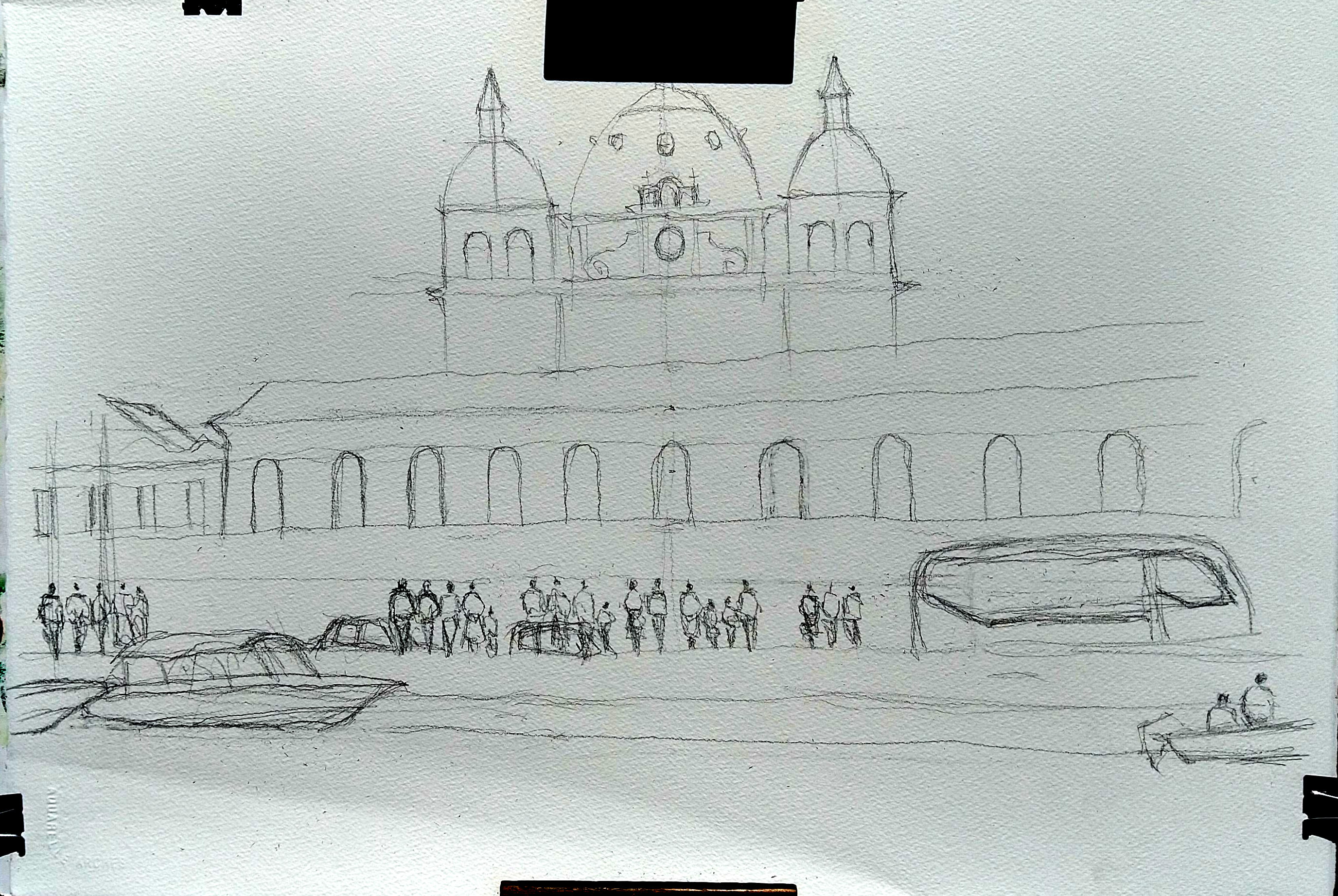 Debajo muestro el continuo del proceso de elaboración de la acuarela. Inicié por las pinceladas básicas: cielo, torres, cubierta y sombras de la Alcaldía, más las murallas.