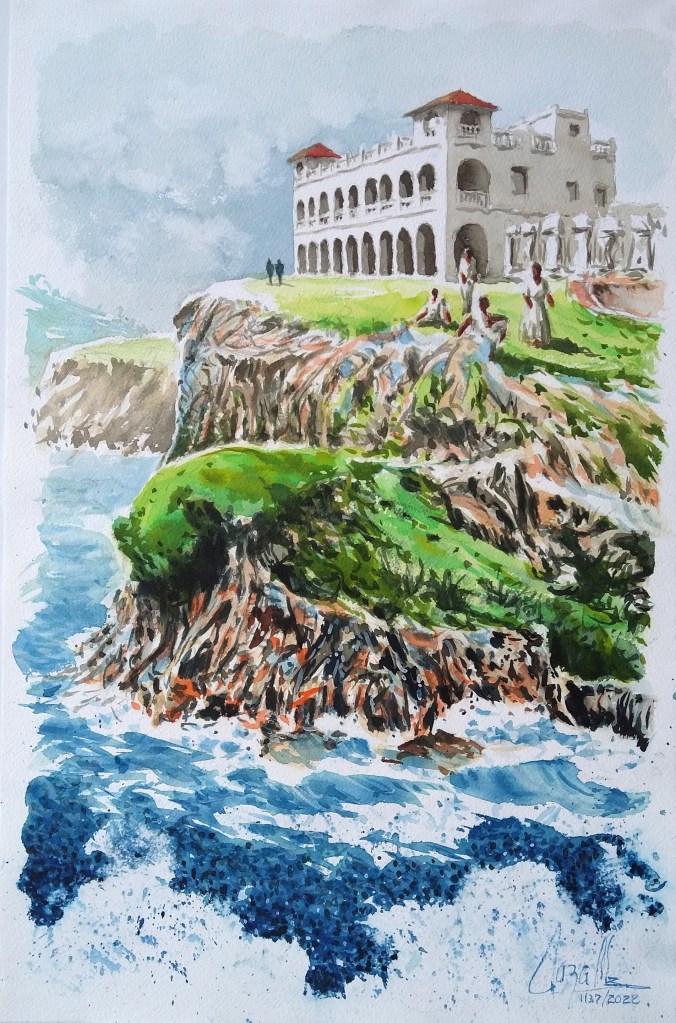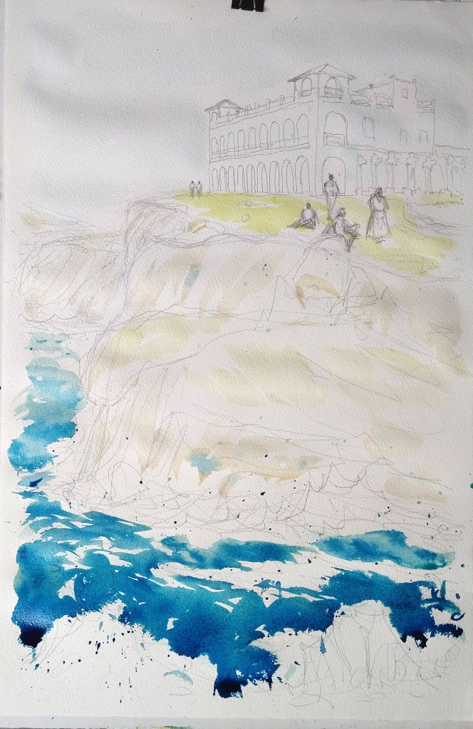 Arriba a la izquierda, percibimos el mar y su fuerte oleaje en primer plano, eso le da altura y profundidad al cuadro. Se empezó a colorear las pinceladas básicas del cielo, el terreno y los riscos y por último las sombras del castillo.