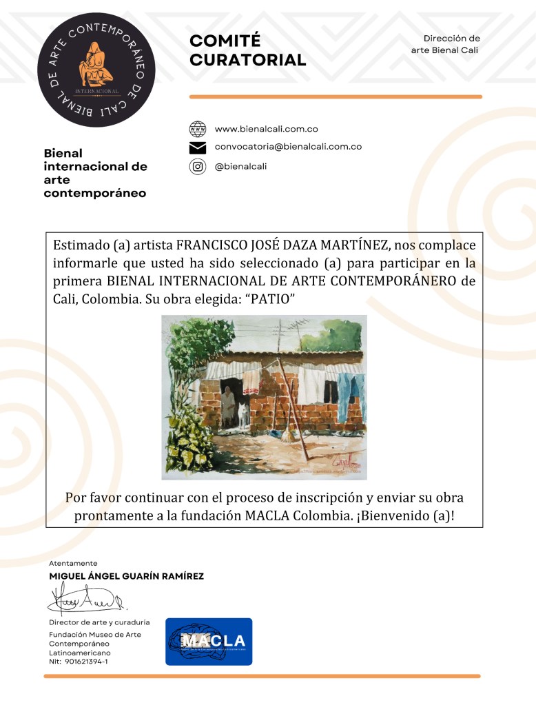 He sido seleccionado a participar en la I BIENAL INTERNACIONAL DE ARTE CONTEMPORÁNEO en Cali, Colombia, del 26 de septiembre al 2 de octubre de 2022. Nos vemos en Cali.
