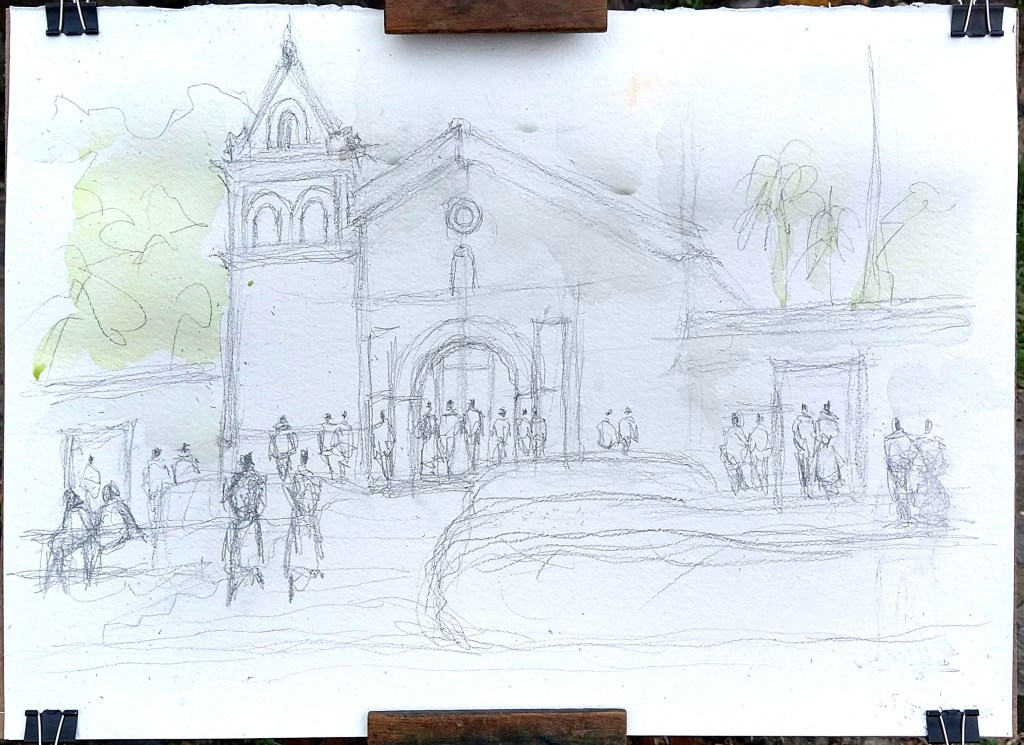 Iniciamos la faena pictórica ubicándonos hacía el frente de la capilla un tanto a la derecha, bajo un árbol que nos permitió protegernos del sol y a la vez contemplar la que sería la mejor toma. Arriba, imágenes de ubicación con dibujo y momentos de la pintura.