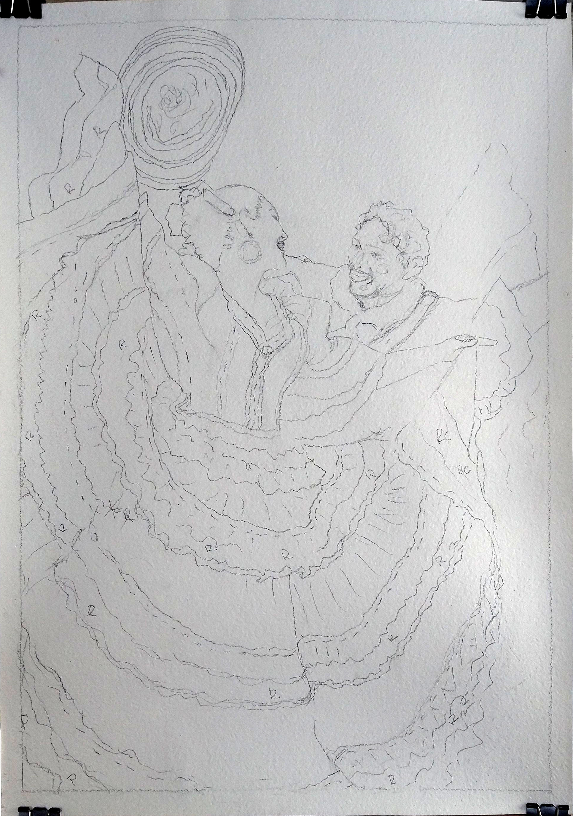 Disfrutemos de la ejecución de esta Acuarela que muestra uno de los momentos más significativos de la Cumbia, como lo es el coqueteo, con esa sonrisa galante y seductora.