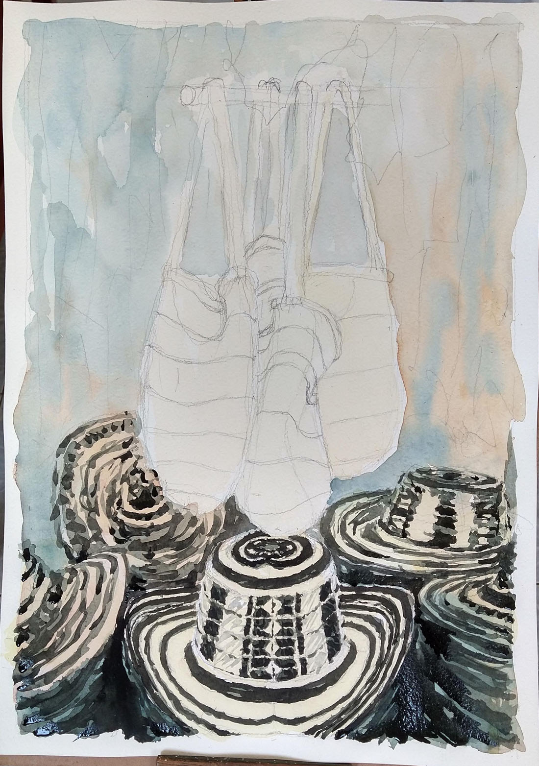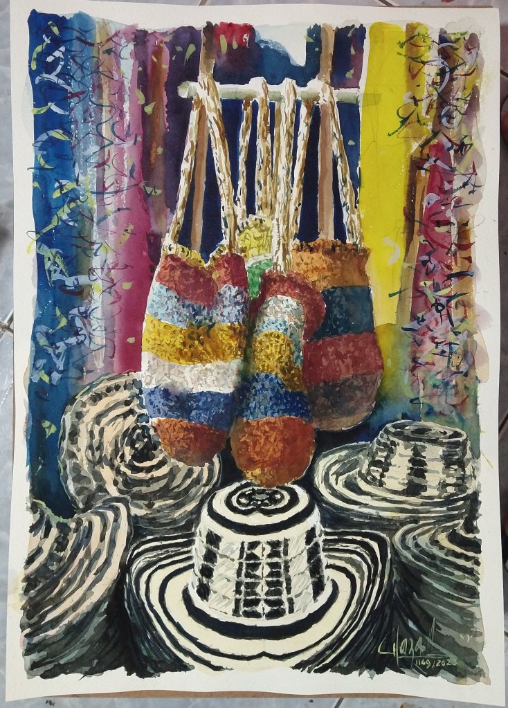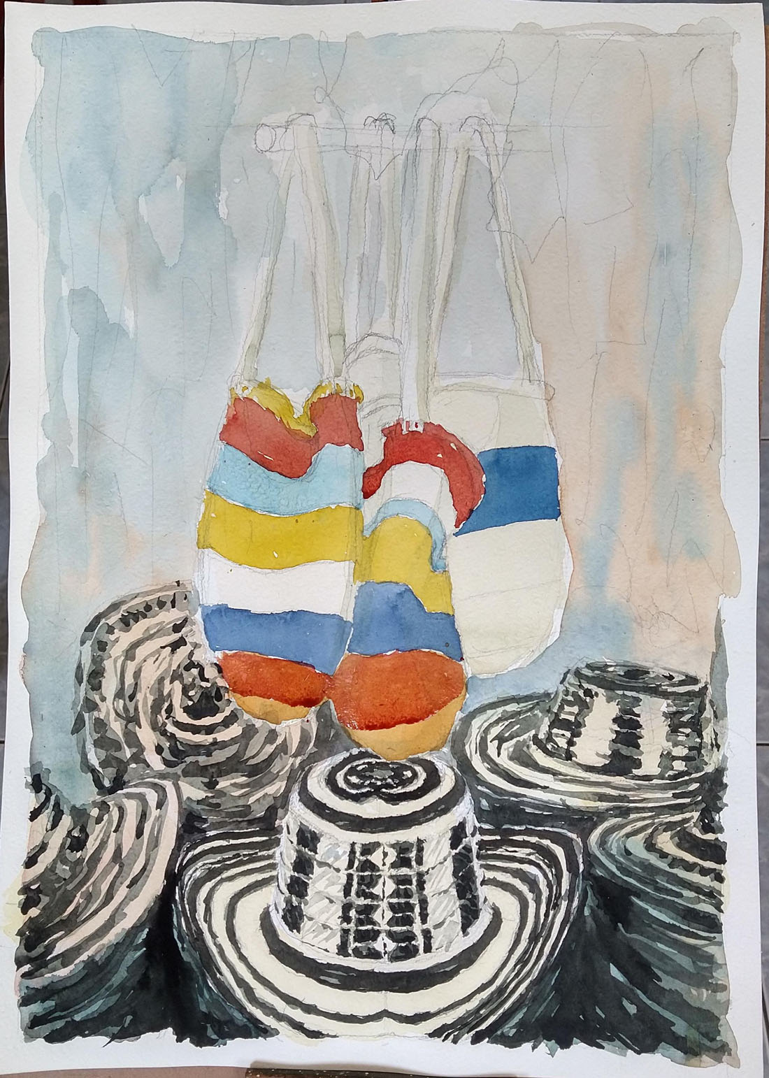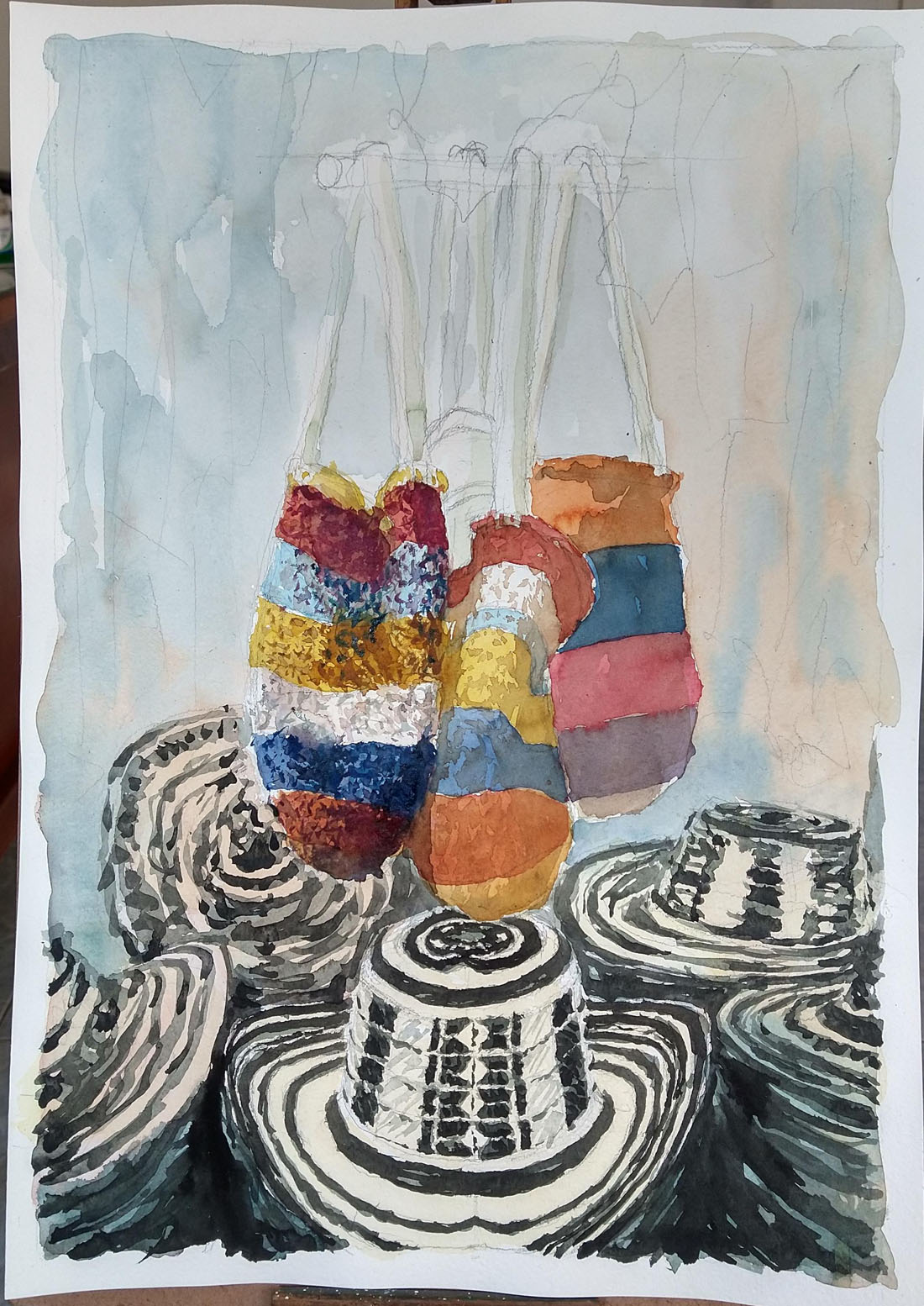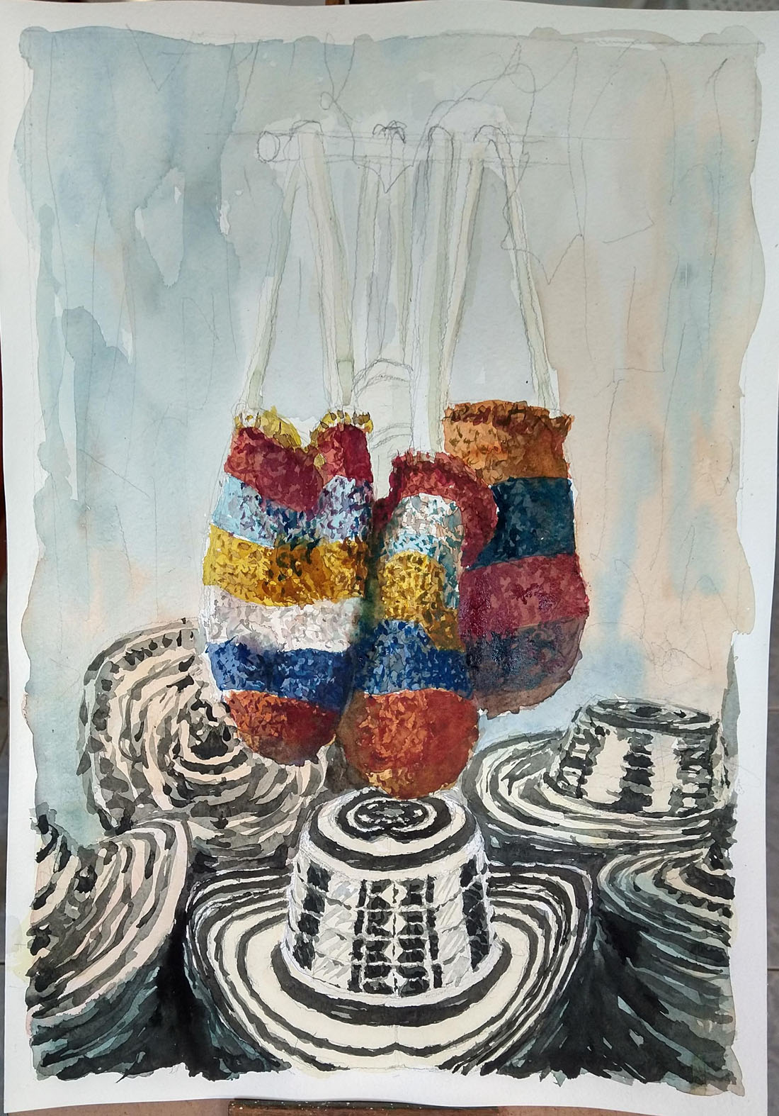 Obtuve las imágenes en la Feria Artesanal de la calle 72 por cortesía de sus artesanos. Dibujé la estructura de esta acuarela en formato vertical, pretendiendo brindar la sensación de altura: las mochilas elevándose sobre los sombreros. Empecé a pintar los fondos, procurando dejar claros el sombreo central y las tres mochilas buscando que se convirtieran en el centro de atención. Seguidamente empecé a trabajar en el sombrero.