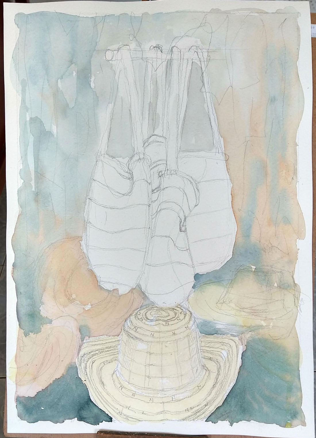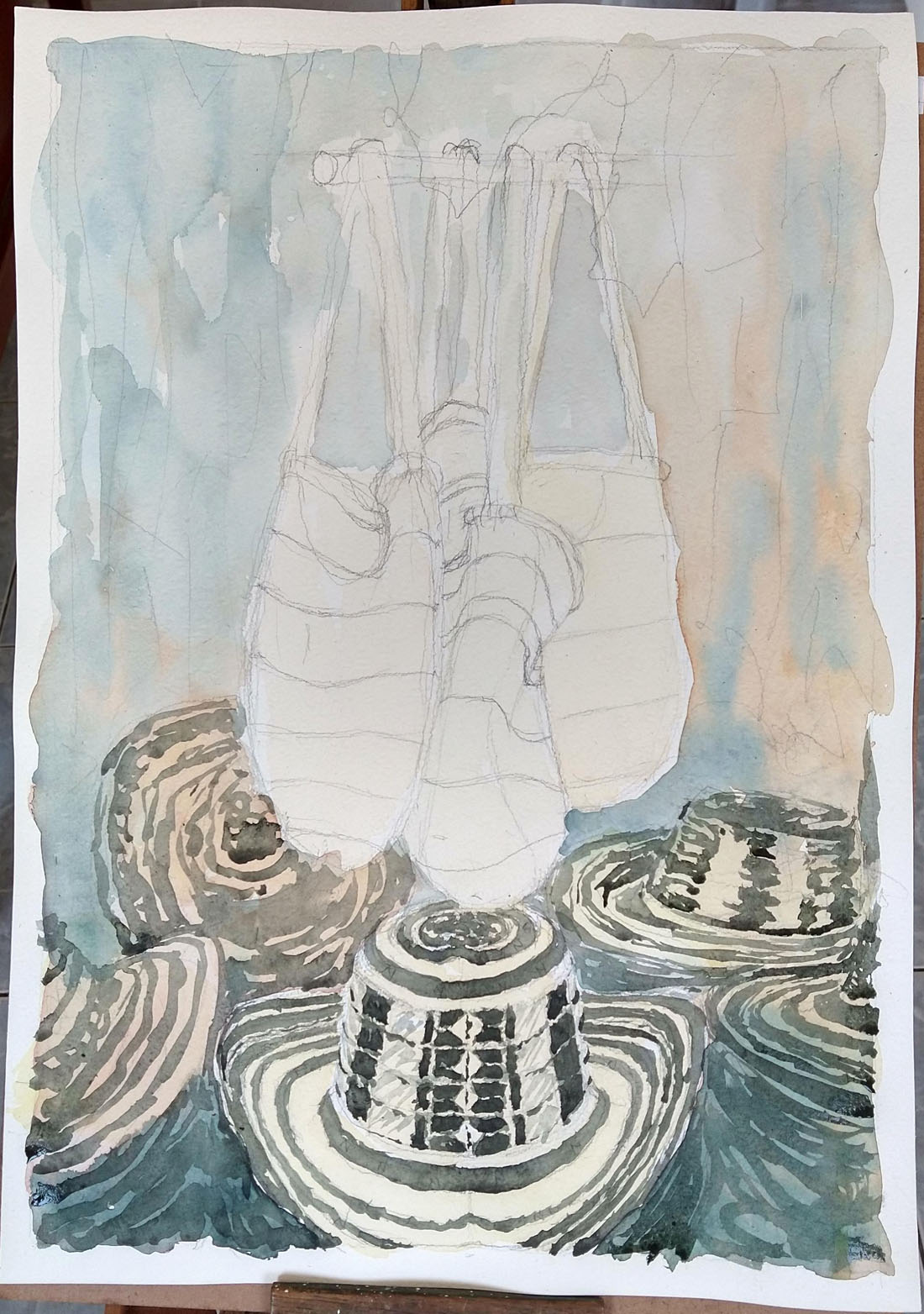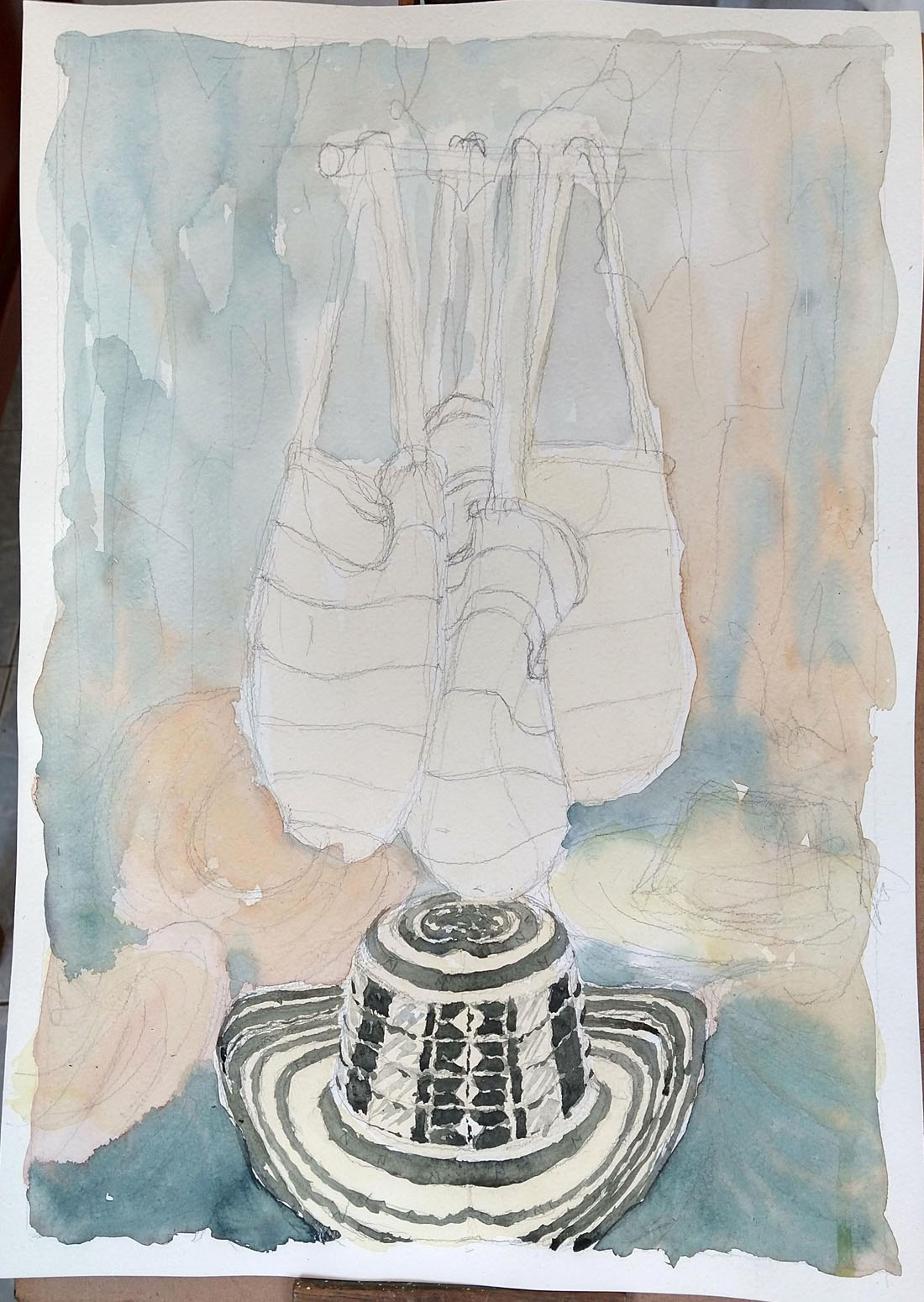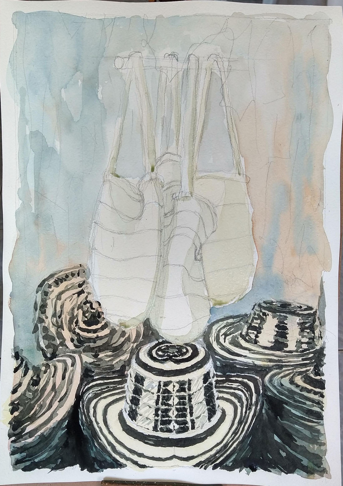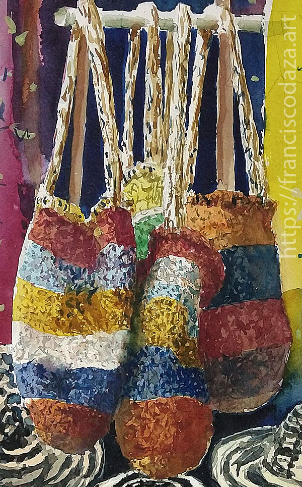 Obtuve las imágenes en la Feria Artesanal de la calle 72 por cortesía de sus artesanos. Dibujé la estructura de esta acuarela en formato vertical, pretendiendo brindar la sensación de altura: las mochilas elevándose sobre los sombreros. Empecé a pintar los fondos, procurando dejar claros el sombreo central y las tres mochilas buscando que se convirtieran en el centro de atención. Seguidamente empecé a trabajar en el sombrero.