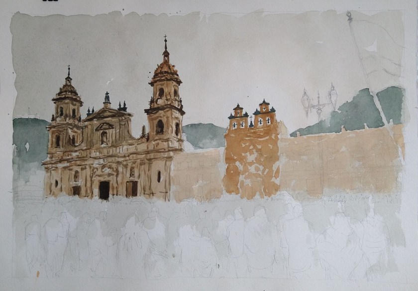 Atardecer con el sol sobre los cerros, dando al cielo ese tono de gris amarillantado que me cautivó. Comencé a pintar el cielo con esa tonalidad y lo llevé a la totalidad del cuadro para dotarlo de esa atmósfera. Seguidamente seguí con los cerros al fondo y los ocres de base al patrimonio arquitectónico. Así plasmé la base superior del cuadro, dejé la base inferior, la de la multitud para después. Proseguí con las puntas y las cúpulas oscuras y poco a poco fui bajando para detallar la fachada de la Catedral.