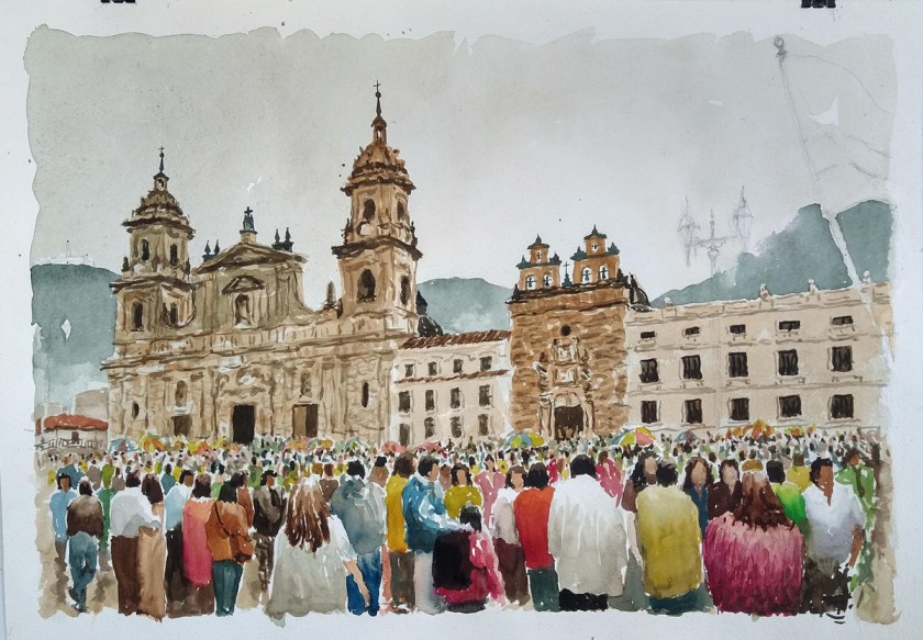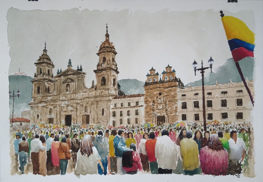 Para finalizar representé las luminarias y la bandera; en la esquina lateral de la Catedral, la Casa del Florero, lugar donde se gestó la independencia; y allá al fondo sobre los cerros, la Basílica Santuario del Señor Caído de Monserrate.