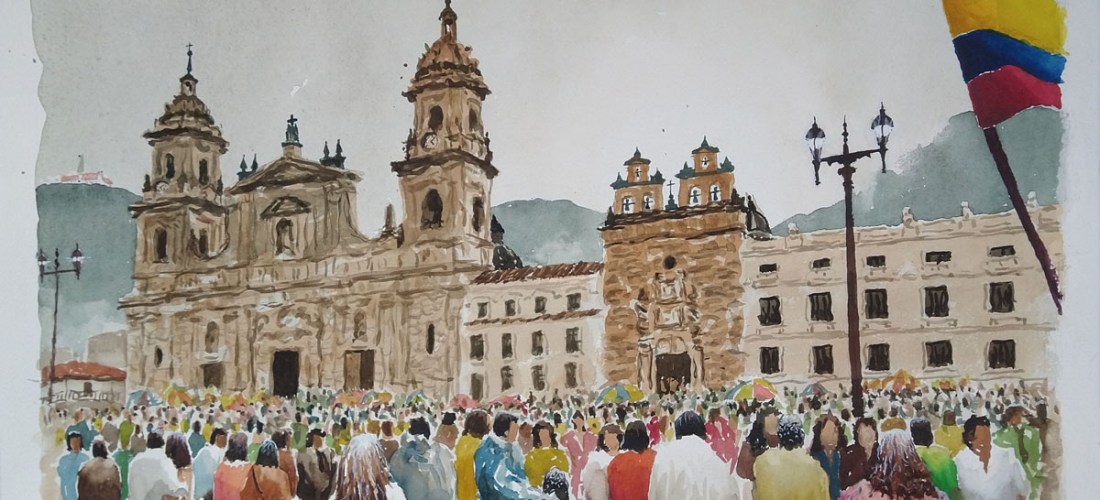Para finalizar representé las luminarias y la bandera; en la esquina lateral de la Catedral, la Casa del Florero, lugar donde se gestó la independencia; y allá al fondo sobre los cerros, la Basílica Santuario del Señor Caído de Monserrate.