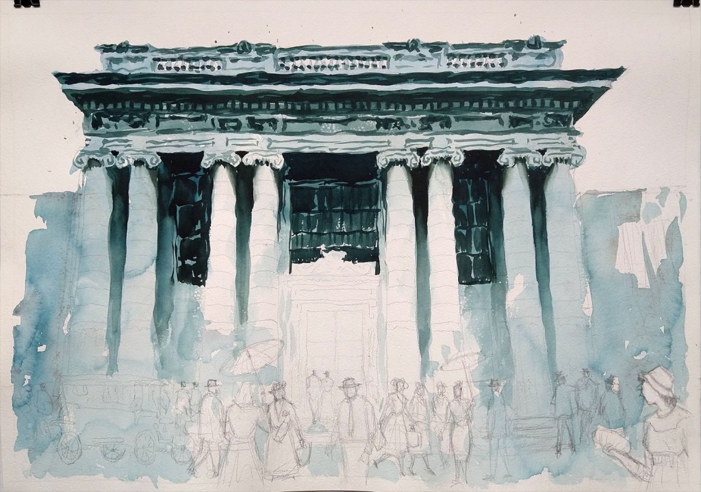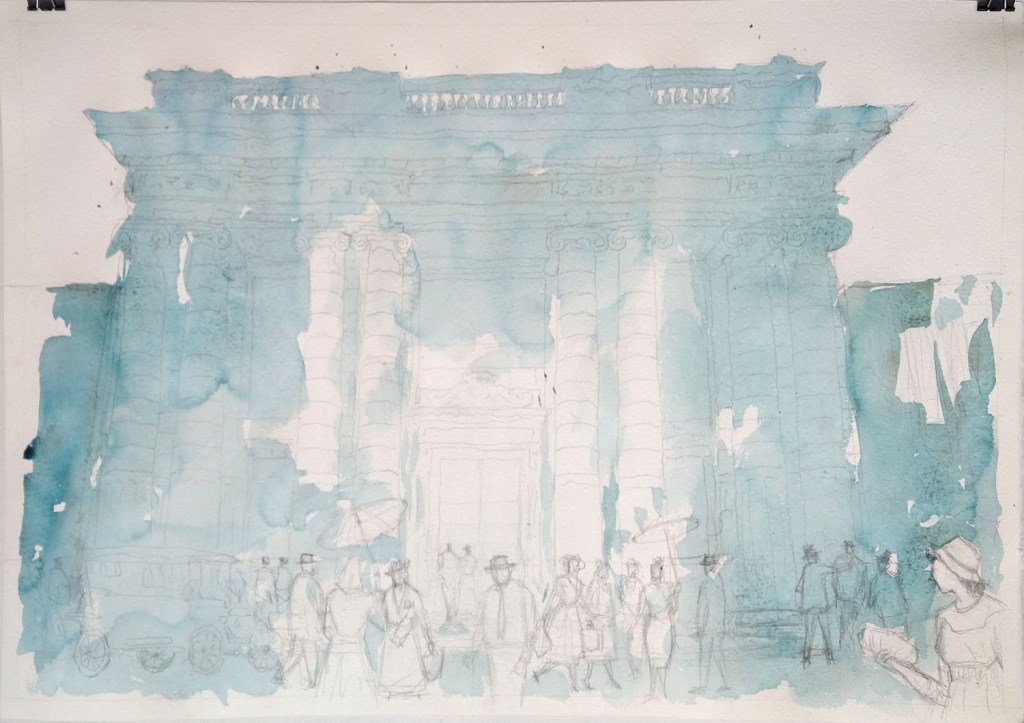 Seguí con las primeras aguadas, se dejó en blanco la puerta principal y sus columnas laterales, buscando darle prioridad a la entrada, se oscureció con azul un tanto el resto.