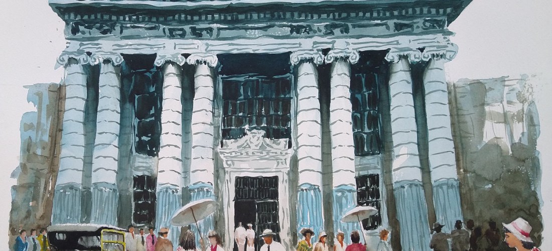 Pretendí con esta Acuarela recrear un escenario de los años 30 con el Banco Dugand de fondo. De ahí la vestimenta, las poses y el auto. Empezamos con la estructura, el dibujo.