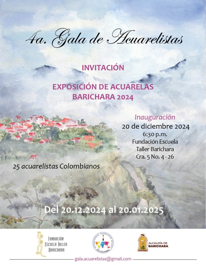 Exposición organizada por la Fundación Escuela Taller Barichara en cabeza de la Maestra Martha Isabel Ruiz Dueñas, con la colaboración de la Alcaldía de Barichara e IWS Colombia International Watercolor Society. Además de la muestra podremos asistir a diversos talleres de acuarela disponibles. La muestra de Acuarelas se conformó con la participación de los siguientes 25 Artistas: