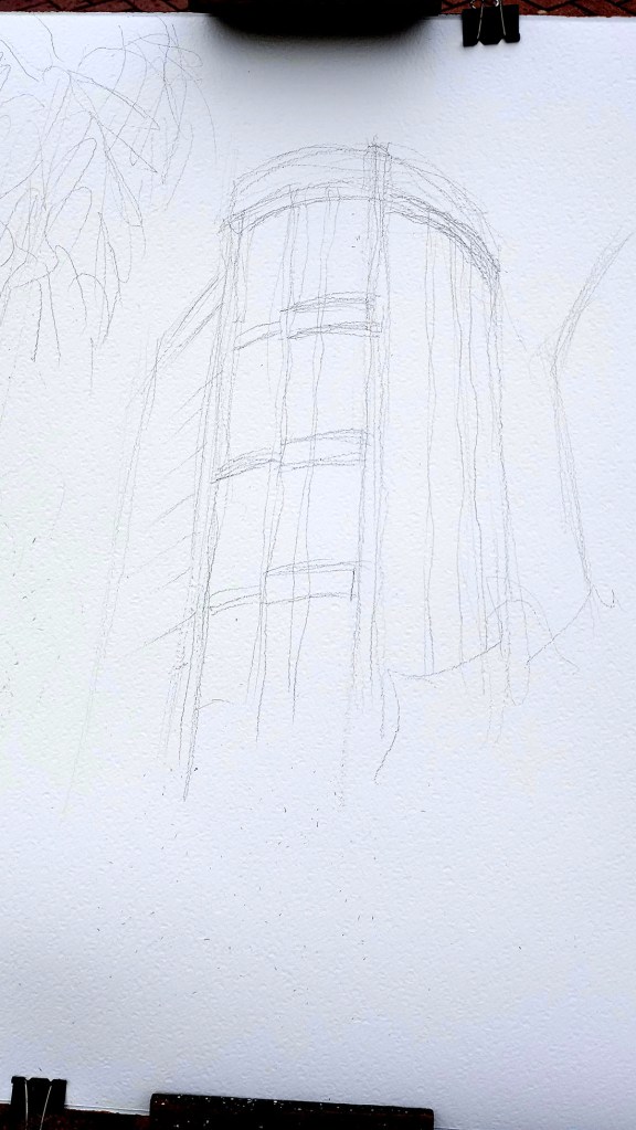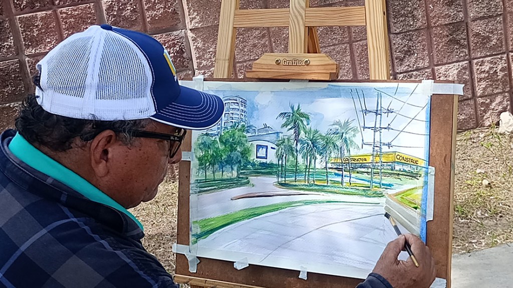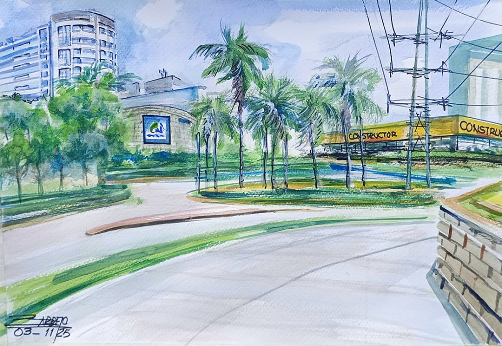Entre las estructuras que nos rodeaban, decidí enfocarme en la torre Hilton Garden Inn Barranquilla. Su presencia imponente, rodeada de vegetación y movimiento urbano, me inspiró a capturarla en acuarela, directamente desde la acera, bajo un día nublado, el murmullo de la ciudad y en ocasiones bajo el sol.