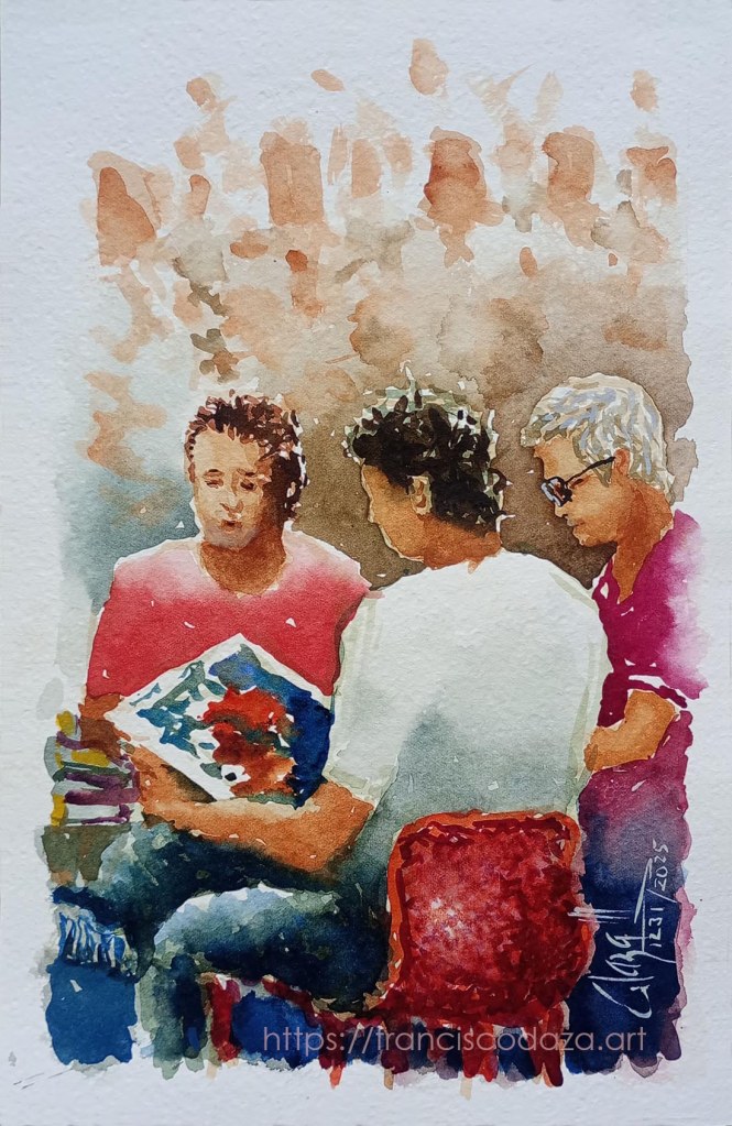 El segundo grupo estaba más cerca de mi, con los participantes muy juntos, lo que me llevó a optar por un formato vertical. Comencé por la silueta del joven de espaldas mostrando su trabajo a los demás o pintando directamente sobre su lienzo, y luego con los dos compañeros que lo acompañaban. El proceso siguió como en la primera: listas las siluetas, pasé a las pieles, después a los vestidos y la silla. El fondo se insinuó con figuras humanas difusas de pie, observando a las personas en la mesa.