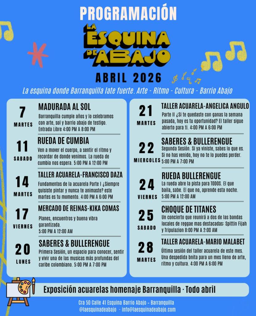 Este martes 7 de abril, en el corazón del Barrio Abajo, celebramos el cumpleaños de Barranquilla como mejor sabemos hacerlo: con arte, calle y alma caribe. En la Esquina de Abajo, en la Carrera 50 con Calle 41 esquina, entre las 4:00 y 8:00 p.m.