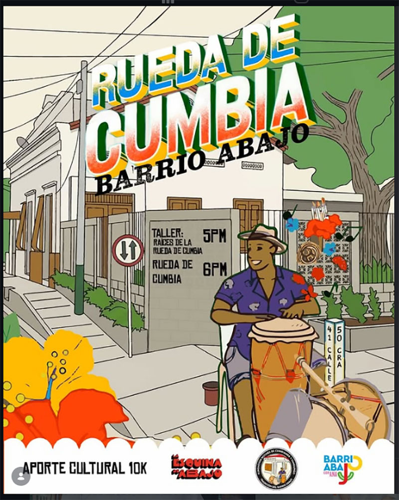 Iniciaremos a las 5:00 PM con el Taller: «Raíces de la Rueda de Cumbia» y seguimos con la » Rueda de Cumbia» desde las 6 p.m. hasta que el cuerpo aguante.