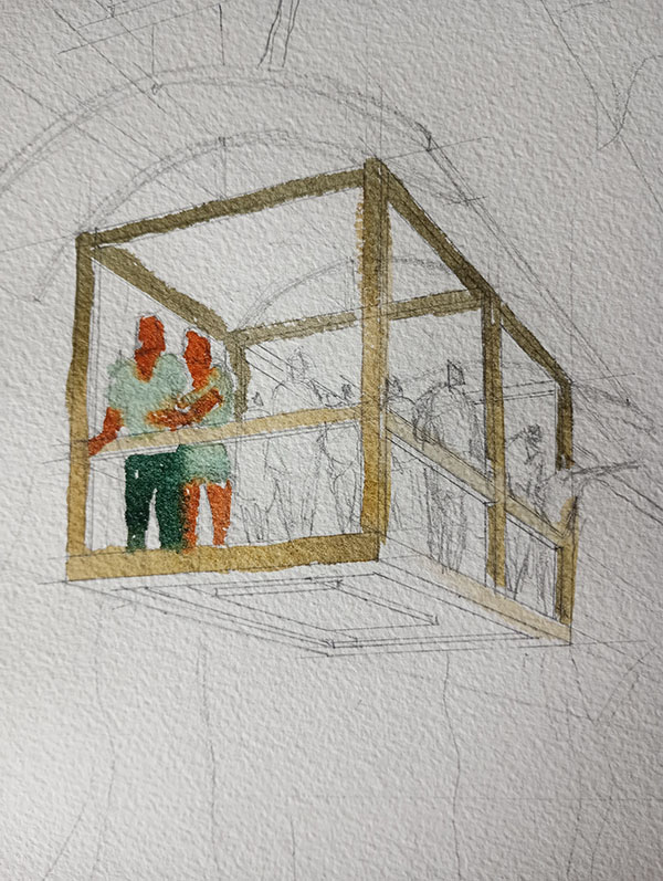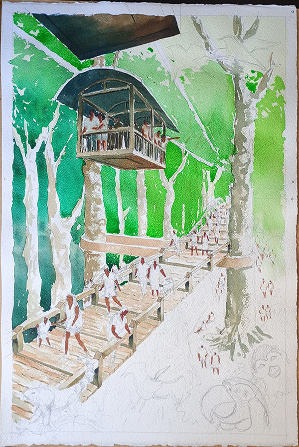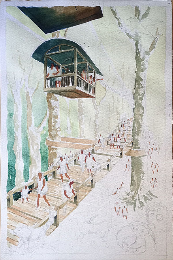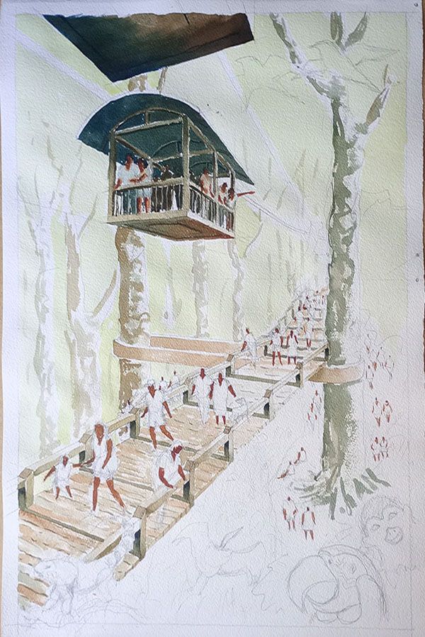Dibujo. Estructura de la torreDibujo de la ambientación en la parte inferior y primeras aguadasAcuarela casi finalizadaAcuarela terminada