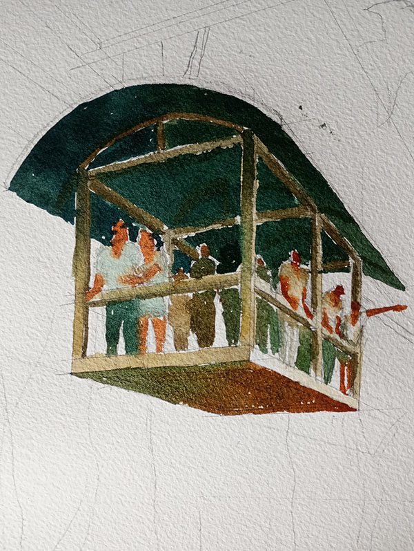 En los dos personajes en la parte derecha del balcón, se logró el oscuro pintando directamente sobre el fondo del cielo, pero el otro se logró humedeciendo el papel y pasando el pincel casi seco hasta quitar el color oscuro, dando la apariencia de una camisa blanca.