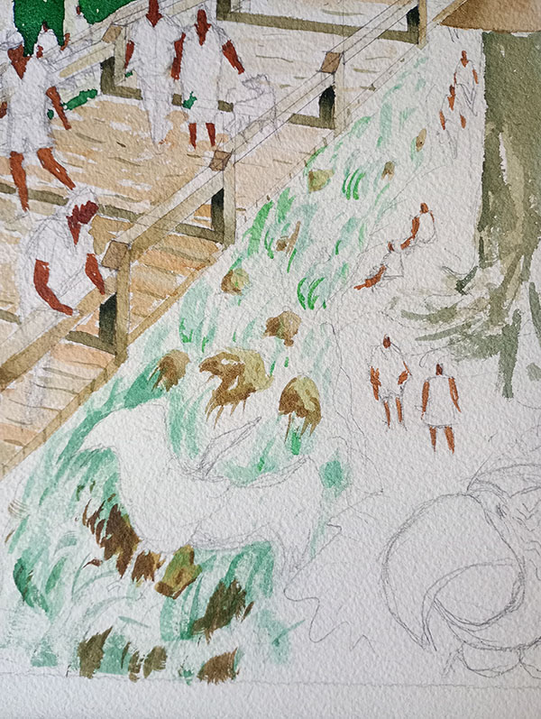 Las dos mujeres de la parte inferior a la izquierda en la acuarela terminada, se lograron cortando la superficie del papel con bisturí para dejar a la vista las blusas blancas.