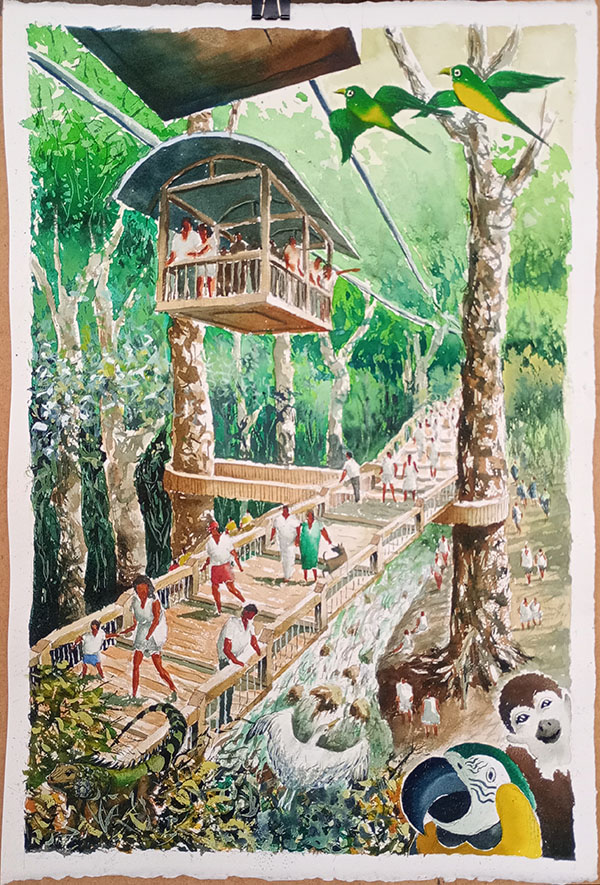 Aquí se representa la ambientación natural, conformada por la exuberante vegetación en la que se inmerge el proyecto y su representación en la acuarela.