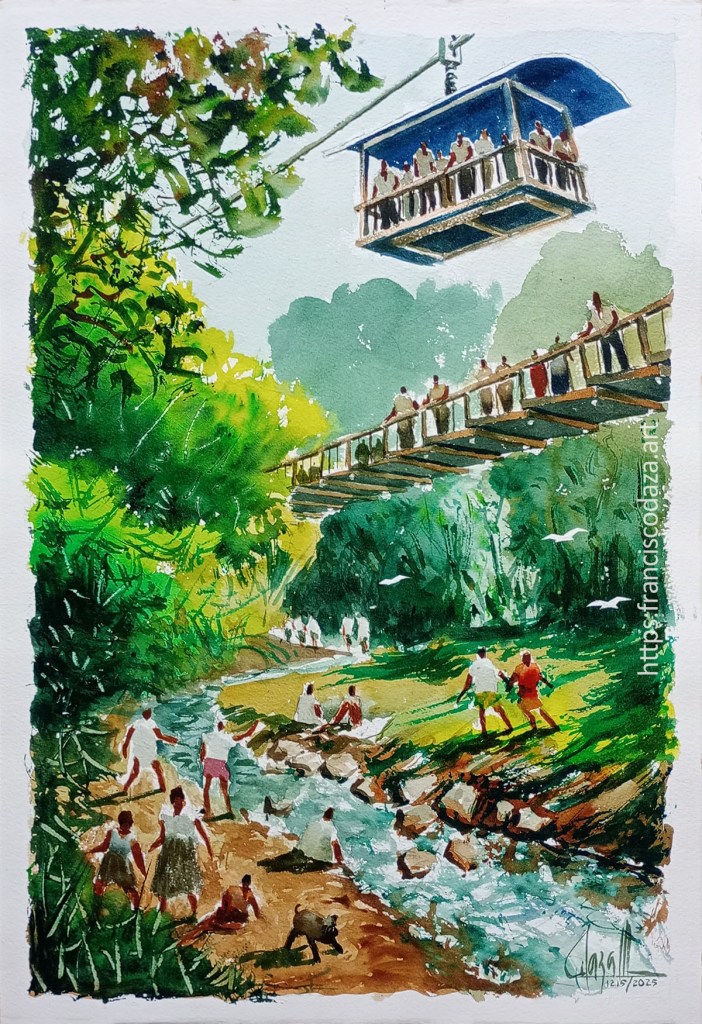 Esta Acuarela parte de una vivencia contemplativa frente al «Arroyo del Country», un rincón natural en Barranquilla que invita a imaginar. Junto a Ignacio Consuegra, Manuel De Los Ríos y los miembros de la IWS Colombia, Capítulo Barranquilla, surgieron ideas que transformaron ese espacio en un corredor peatonal imaginado: ladera, puente colgante y teleférico.” La explicación completa de esta propuesta imaginativa puede consultarse en: https://franciscodaza.art/2025/10/04/teleferico-puente-y-ladera-diseno-de-transito-peatonal-en-el-arroyo-del-country/