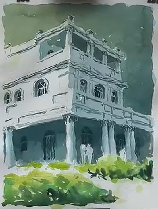 Entre las estructuras que nos rodeaban, decidí enfocarme en la torre Hilton Garden Inn Barranquilla. Su presencia imponente, rodeada de vegetación y movimiento urbano, me inspiró a capturarla en acuarela, directamente desde la acera, bajo un día nublado, el murmullo de la ciudad y en ocasiones bajo el sol.