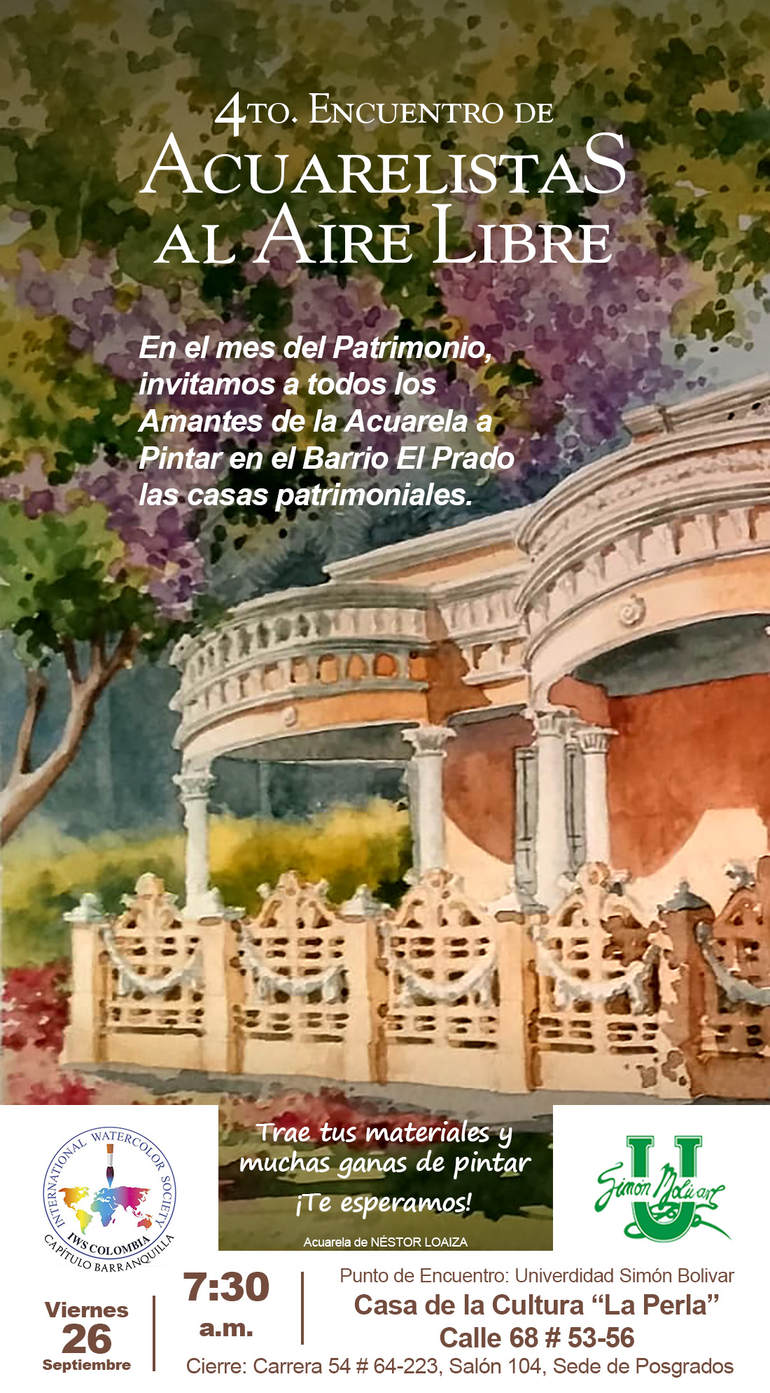 El pasado 26 de septiembre los Acuarelista IWS Colombia, Capítulo Barranquilla, celebramos el 4to Encuentro de Acuarelistas al Aire Libre. En el marco del mes del Patrimonio, nos dirigimos al Barrio El Prado para pintar sus casas patrimoniales, testigos silenciosos de la historia y belleza urbana barranquillera.