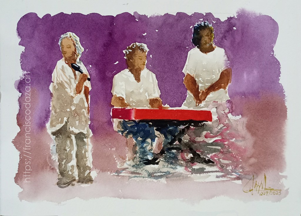 El pasado 6 de diciembre en la Galería a Cielo Abierto organizada por Barracuda Café Cultural, nos reunimos 10 acuarelistas para pintar y presentar nuestros trabajos. Me dediqué a pintar en vivo y en directo los personajes asistentes al evento: pintores, cantantes, músicos y público en sus diferentes poses. Ubicado en una esquina tuve acceso a todo el escenario de la galería, donde logré realizar las siguientes representaciones.