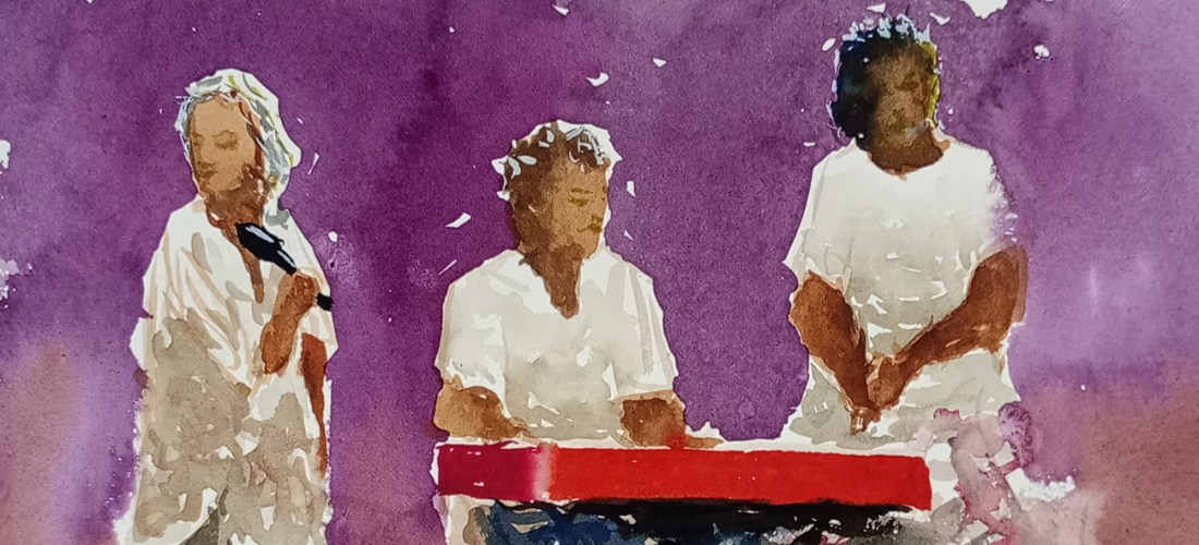 A unos 20 m. de donde me encontraba, observé un grupo de familiares muy divertidos, departiendo alrededor de una mesa. Inicié con las siluetas directamente con el pincel delgado y aguada clara, luego la primera base de pieles y detalles de sombras. Seguí con vestidos y sillas, trabajando todo a la vez. Al definir la escena, añadí el entorno: mesas con personajes sentados sugeridos con manchas y otros al fondo de pie en tonalidades claras.