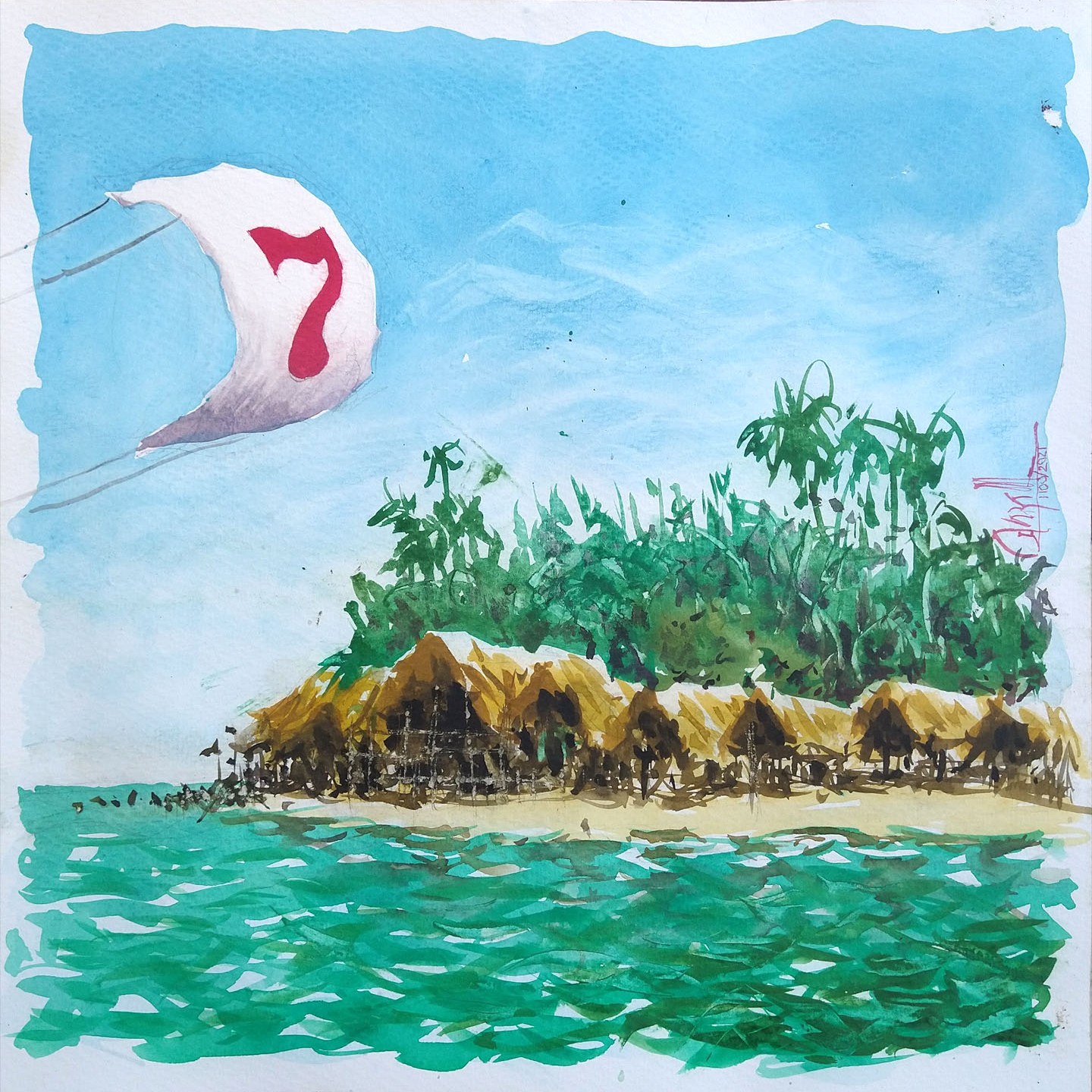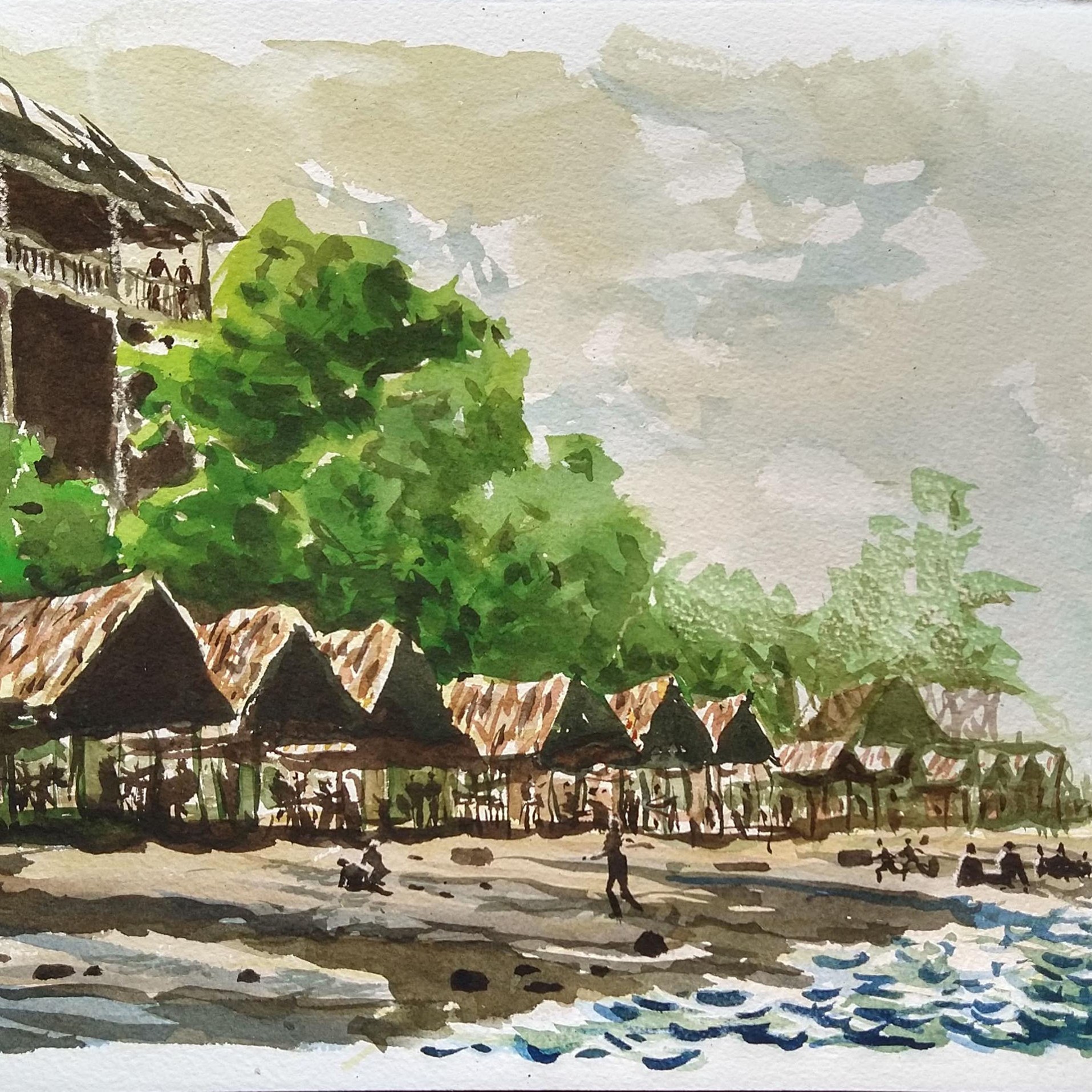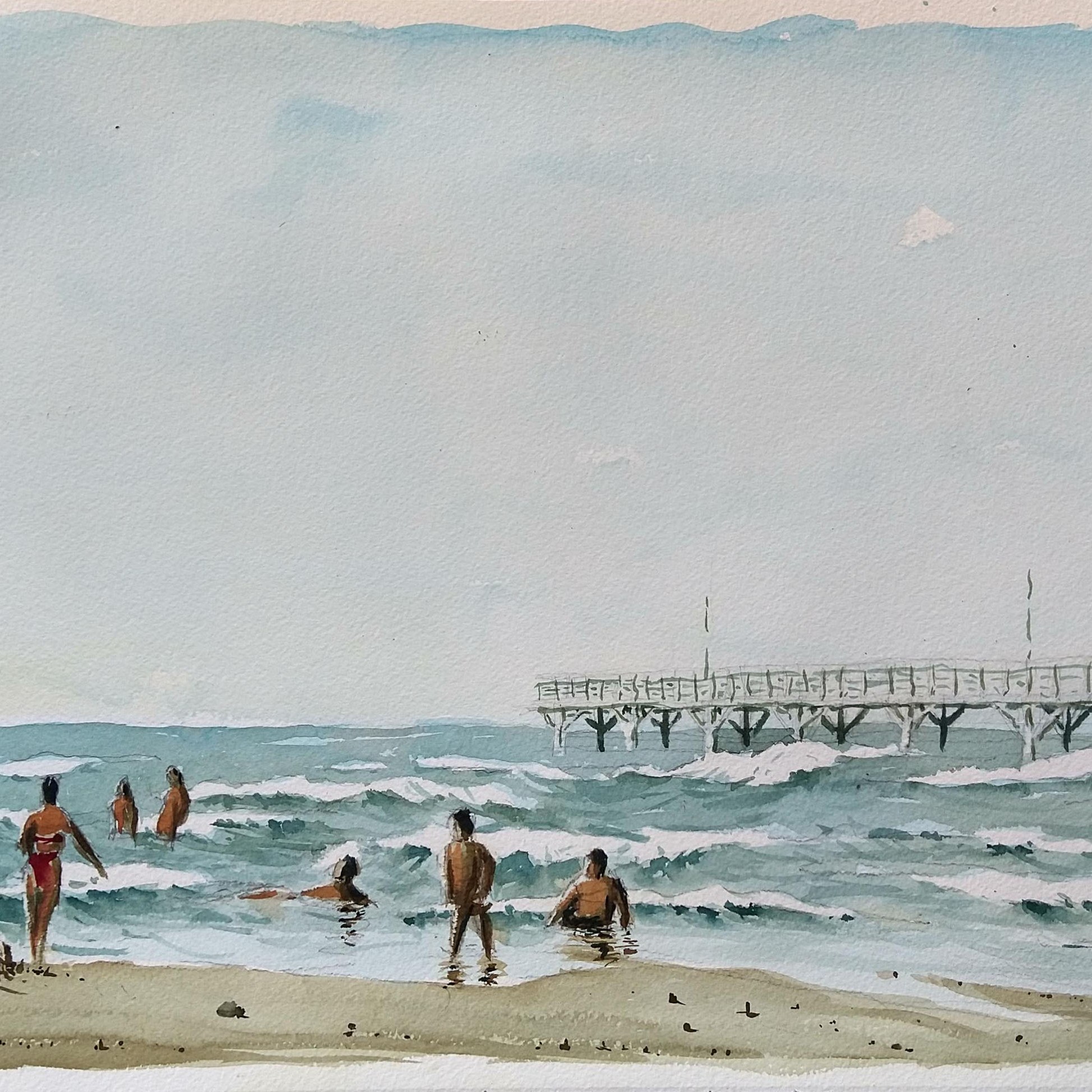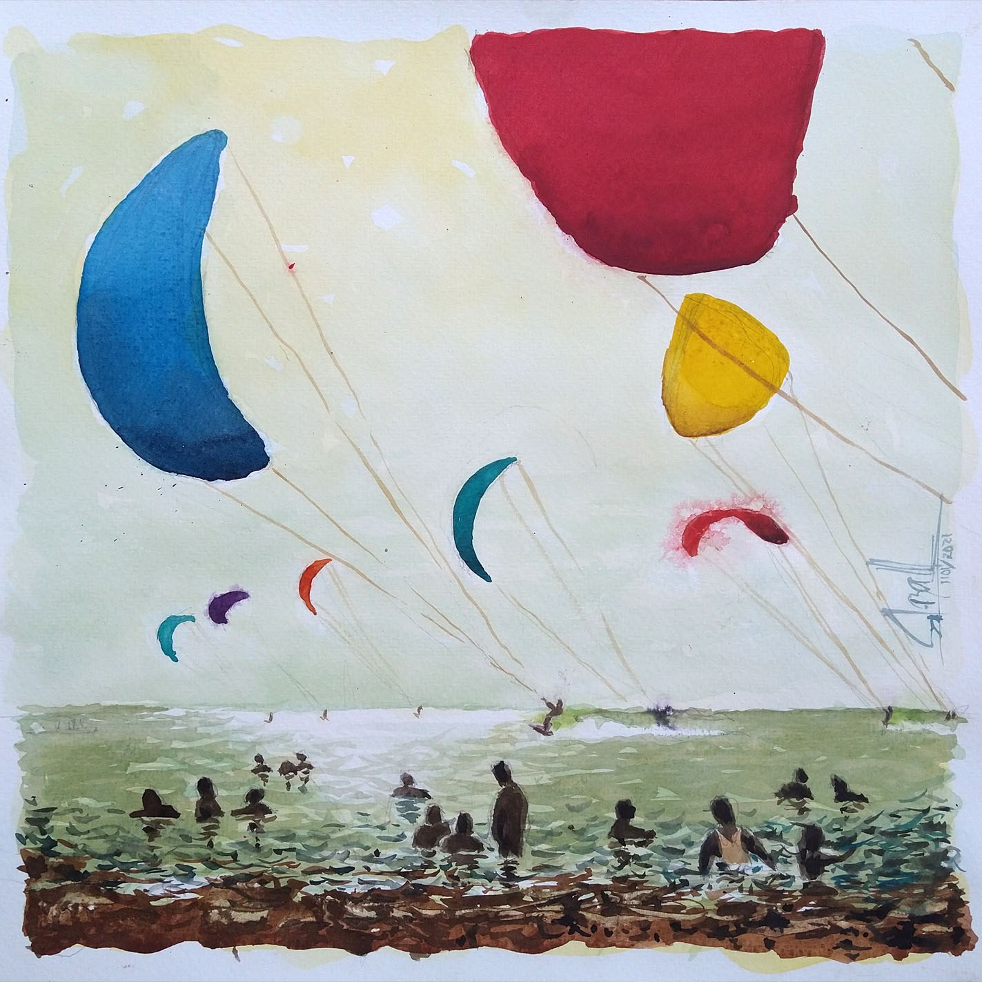Fin de año en Puerto Colombia. La playa permite percibir la extensión y profundidad del espacio que se extiende desde mi pupila hasta los confines del cielo, además, la Luz, la atmósfera, la dinámica de la quietud y en esta, la sucesión de formas y colores. En el espacio se manifiesta el alma del instante, del aquí y ahora percibidos. 5 Acuarelas realizadas, 3 están disponibles.